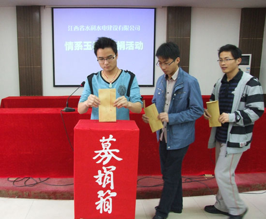 2010年4月14日,青海省玉樹縣發(fā)生兩次地震,最高震級7.1級,造成了當?shù)鼐薮蟮娜松韨龊拓敭a(chǎn)損失,“玉樹地震”牽動著億萬人民的心,也牽動著我司所有員工的心!公司在全司范圍內(nèi)積極開展“情系玉樹募捐活動”,4月26日,我公司南昌市機關總部首先開展了“情系玉樹募捐活動”,公司中層以上管理人員和員工踴躍參與募捐活動,紛紛獻上自己的一份愛心,體現(xiàn)出江西水總?cè)说纳鐣熑胃校⊥瑫r,各分公司、國內(nèi)外施工項目部也在開展此項活動,預計此項活動將募得資金3萬余元。