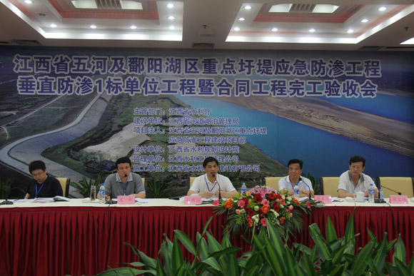 2011年5月8日,我公司承建的江西省五河及鄱陽湖區重點圩堤應急防滲處理工程垂直防滲1標單位工程暨合同工程完工驗收會在南昌市召開。省水利廳廳長孫曉山,廳紀委書記李東江,副廳長文林、廳總工張文捷,省發改委、省財政廳、省水利廳有關處室及有關單位負責人,南昌市水利局等領導出席了會議。